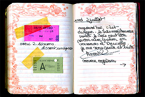 Aujourd’hui, c’est dingue. Je suis malheureuse. Voilà. Je vais peut-être partir avec Grimm en vacances à Deauville. Je me sens seule et triste. Comme Myriam : Petite flèche qui indique qu’à la page suivante est collée une lettre de Myriam qui, elle aussi, est « seule et triste ».