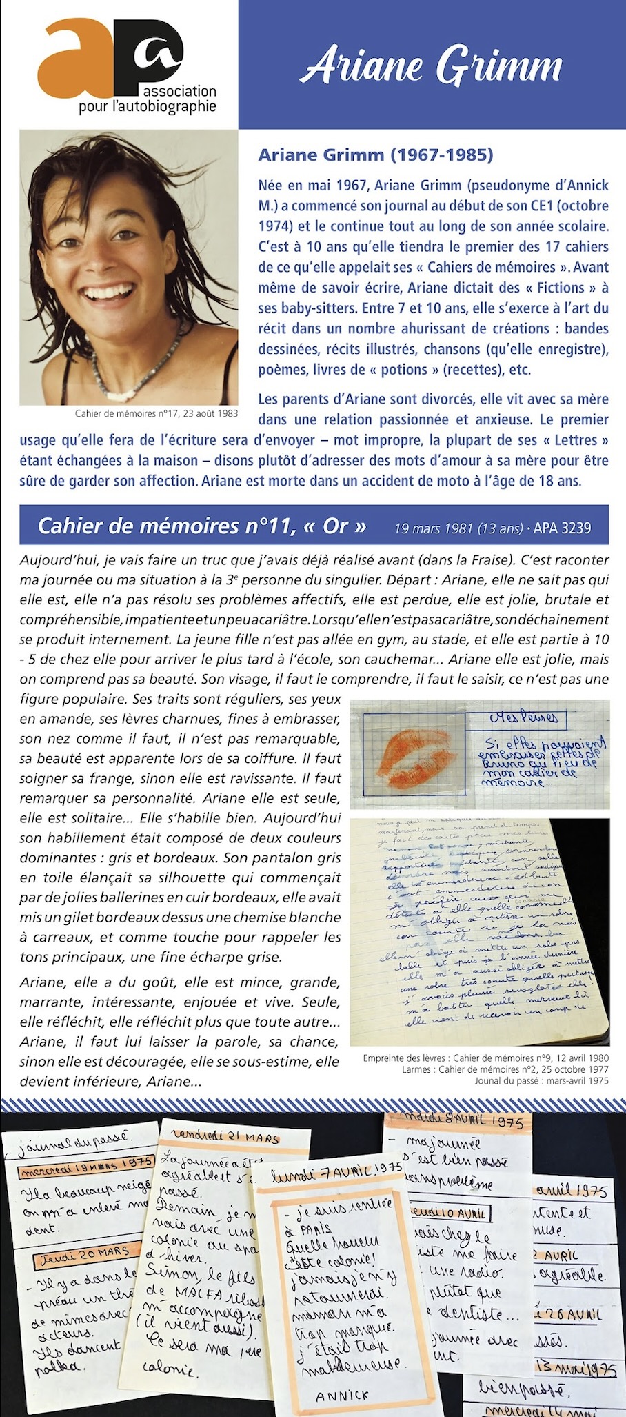 - Philippe Lejeune, octobre 2009. "Une odeur d'enfance" Ariane Grimm, conférence donnée à la Société des Arts, Palais de l'Athénée à Gen�ve, avec projections (diaporama)