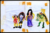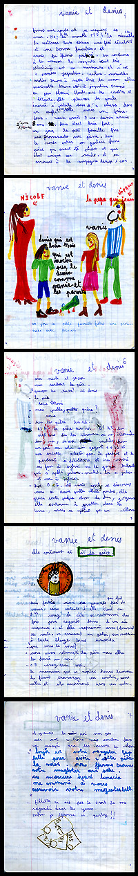[...] Et ils arrivèrent à l’école. Pour y aller, il fallait traverser toute une rue. Ils trouvèrent une grande porte où était marqué : 1899. ECOLE PRIMAIRE DE GARÇON ET DE FILLE. Ils appuyèrent sur un bouton blanc indiqué d’une flèche, traversèrent un couloir, puis une porte, puis encore une porte. Tout était silencieux comme dans un palais. Ils virent une cour et vinrent se ranger par deux et d’ailleurs, ils étaient en retard. Ils montèrent en suivant la maîtresse. Ils montèrent un escalier, près d’un couloir, ils entrèrent dans la classe. Vanie se déshabilla, mit son manteau dans une salle spéciale, son bonnet, ses gants, ainsi que les autres enfants. La maîtresse sévère s’avança vers Vanie et au tableau lui fit faire une addition : 45 + 11 = ? Elle marqua la réponse juste, puis au tour d’un autre enfant Jean-Maret, après Bruno. Puis on frappa. Un monsieur professeur de chant s’avança vers la maîtresse, ôta son chapeau et le remit... Regardez l’ouverture de l’autre côté de la page. C’est un dessin. Tirer sur une ficelle, puis sur l’autre. Après enlever le fil, tourner à l’envers : La famille : Denis Vanie Nicole Jean [cliquer