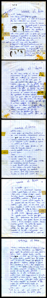 3ème épisode : Denis a perdu son pari. Le lendemain, Denis donna à Vanie 6 francs,50 et une sucette. Et il se déculotta à midi et il montra ses fesses à Sylvie. Sylvie ria et ria, elle se mit avec Vanie qui riait aussi, ainsi que quelques personnes de la classe qui étaient au courant. En arrivant en classe, Denis eut honte de lui-même et pleura. La maîtresse demanda : « Qu’as-tu Denis ? ». Les enfants riaient. Denis inventa qu’il avait mal à son pied. « Comment ça ? Mais ce n’est rien ! ». Quelqu’un entra : ce fut la directrice avec les livrets : - Isabelle Clément : 10 - Très bien. Dans l’écriture : moyen. Vanie et Denis : très très très bien. 10 10 A A - oui ! Choisissez vos images. etc, etc, etc. Denis se réjouit, Vanie aussi. Les parents étaient fiers. La poule les attendait le soir et d’ailleurs, elle avait perdu une plume. On acheta un coq. On eut des œufs sans problème. Vanie était triste de ne pas avoir ses insectes. Denis s’en fichait. Il aimait plutôt le coq et la poulette. [...]