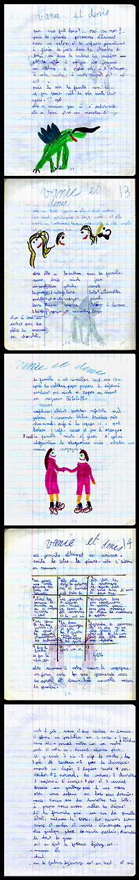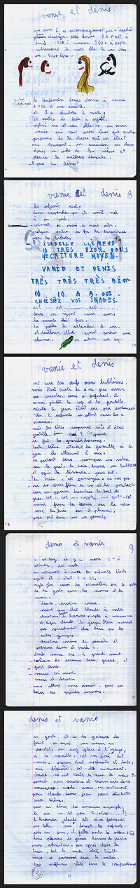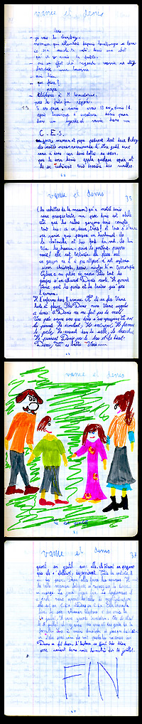 9ème épisode : histoire de la pieuvre et du poissonnier. La famille Nicole et Jean s’appelait Chaguolire. [...] Un jour, ils allèrent au cinéma. Voilà le titre : « La pieuvre ». Voilà l’histoire en résumé : Un jour, une vieille femme alla faire ses courses. Elle alla chez le poissonnier et demanda quelle drôle de bête était là ? Le poissonnier ne répondit point et avait l’air d’avoir le fou rire. Alors la femme demanda si ça se mangeait ? En vérité, c’était une pieuvre. Il répond non... mais la dame la prit quand même et la mit en décoration dans son appartement. La pieuvre pourrit... et sentit mauvais (on dirait les malheurs de Sophie). Un jour, il y eut des invités et ils virent la pieuvre et poussèrent des exclamations. La dame était ennuyée et jeta la pieuvre après les explications des gens et gronda le poissonnier. Et en plus, n’y va plus jamais et dit du mal de lui. Un jour, elle alla chez le boucher : ce fut la même chose pour un os. FIN Alors, revenons à notre maison de campagne. Un jour, Vanie fit une promenade avec les parents et trouva leur nouvelle voisine, la fermière [long et précis récit de cette rencontre avec dialogues. Vanie tente en vain d’interrompre la conversation des grandes personnes]. A la fin, les parents s’en allèrent et grondèrent Vanie : « Voilà, dit la mère, tu n’as pas arrêté d’interrompre, voyons ! - ben, je voulais te dire que la chèvre était drôle. - Ne répond pas, dis donc. Allez avance, ma chérie, ce n’est pas grave mais ne recommence pas. » En arrivant à leur maison plus près de Paris, Vanie et Denis furent contents de retrouver leurs amis, les voisins. [...] --------------------------------------------------------------------