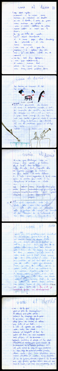 12ème épisode : Vanie est punie. Un jour, une amie des parents de Denis et Vanie demandèrent de garder leur enfant. C’est un garçon de 3 ans. Denis était heureux d’avoir un nouveau compagnon. Vanie, elle, était énervée d’entendre chougnier un petit enfant. Quand il arriva, il prit des crayons, fit des gribouillages sur les dessins au mur de la chambre des grands, puis trouva un clou et l’enfonça dans une prise de courant, aperçut une aiguille et avec appui sur un bibelot... Et puis il fit des bêtises. Excédée, Vanie se montra désagréable avec l’enfant. Les parents lui annoncèrent qu’elle n’allait pas continuer comme ça. Sa maman lui prépara une noise [lui chercha des noises] : - Ma chérie, veux-tu aller dehors jouer à la marelle ? - Oui. - Bon, eh bien pars. - Mais je vais prendre une craie et une boîte. - Bon, je veux bien mais dépêche-toi. - Au revoir. Dis aux garçon qu’il ne faut pas qu’il touche à mon livre bleu des contes bleus du Chat Perché et aussi mon stylo et ma trousse, mon disque, mon cahier, mon cartable. - OK. Ne fais pas de discours. Tu m’entends, oui ou non ? - Oui, bon, eh bien, j’y vais ou j’y vais pas ? - .... Mais pars, bon sang de bonsoir. - Oui, au revoir, je reviendrai à l’heure où je veux ou à l’heure que tu veux ? - A l’heure que tu veux, ma chérie. Bon, eh bien, maintenant, va-t-en, hun ! Enfile le manteau et ton bonnet, là ! » et elle ferma la porte au nez de la fillette. TCHAC... Vanie arriva sur le trottoir et fit une marelle. Sa maman lui avait recommandé de ne pas aller trop loin. Elle aperçut Elisabeth, sa petite voisine qui avançait vers elle. Elle l’appela et vint vers Vanie. [...] Les petites filles jouèrent mais les parents d’Elisabeth vinrent la chercher. Vanie, après la conversation des parents continua la partie seule. Puis, à son aise comme elle l’avait demandé, elle rentra. La mère la regarda derrière la vitre et eut le fou rire. « Tiens, se dit-elle, Vanie rentre. » Elle sonna. La mère lui dit à la porte : « Ah Vanie. Pourquoi rentre-tu si tard ? De toute manière, tu as été désagréable avec le petit garçon, eh bien reste dehors pour la peine. Ça t’apprendra à être gentille » et elle ferma. Vanie traversa la cour, passa tristement vers le mur de briques jaunes et oranges. Elle ouvrit la porte d’un pas lent, les yeux tristes, prête à sangloter. Elle s’arrêta. Elle avait été heureuse jusqu’ici et jamais on lui avait fait de si méchante chose. Elle resta 5 minutes assise sur un banc, puis entendit un pas fort et grand. Vanie ne se retourna pas. Elle savait déjà que c’était sa mère ou peut-être son père. Déjà, elle riait et en même temps, frissonnait. Elle sentit qu’on la prenait par le bras; on la leva, on la rentra, on lui enleva son manteau, son bonnet, ses chaussures et on lui mit ses pantoufles. Et puis elle manga, but et se coucha. Le lendemain, une fête incroyable l’entoura.
