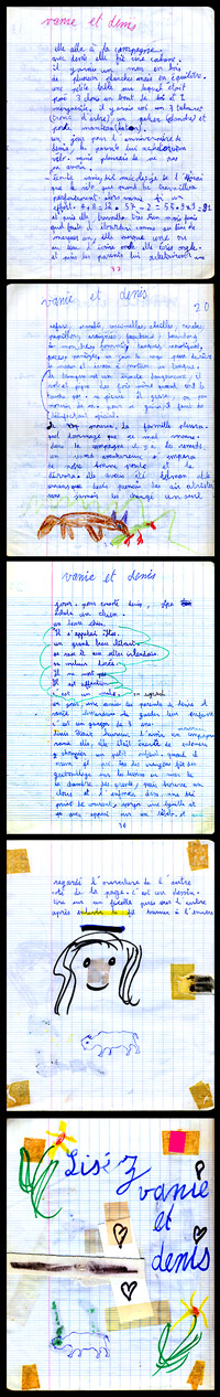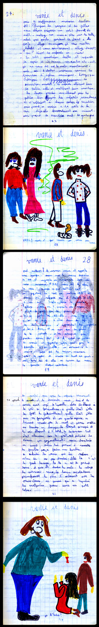 17ème épisode : Papa prépare le dîner. [...] « Le goûter ! » cria papa. Vanie dit : « Oui ! viens vite, le goûter ! - Poil au nez ! ajouta Denis. La fête continua. Papa Jean demanda à Vanie : « Je lâche ? - Oui, dit Vanie. Papa lâcha un bonbon qui tomba dans la main de Vanie. Denis, derrière, souriait, maman regardait la table en fumant. Puis le soir, papa prépara le dîner. Denis mit les couverts, Vanie la nappe et maman se reposa sur le divan. Mais attention ! elle est sportive. Le lendemain, ce fut le rôle de Jean. Dans un vieux placard tout sale où l’on mettait des vieux chiffons, des boîtes de peinture, pinceaux, clous, etc. on vit une fuite : de l’eau coulait goûte à goûte. tic...tac... gloupe. Le placard était un peu mouillé. Vanie prit un chiffon pour nettoyer la commode de maman - et pour qu’elle soit récompensée - et vit la fuite. Papa était là, c’était le midi. Maman, elle, faisait de la gymnastique dans un endroit spécial .Une heure après, elle rentra. Vanie, souriante, vint ouvrir. Le soir, on fit un bon feu dans l’âtre.[...] --------------------------------------------------------